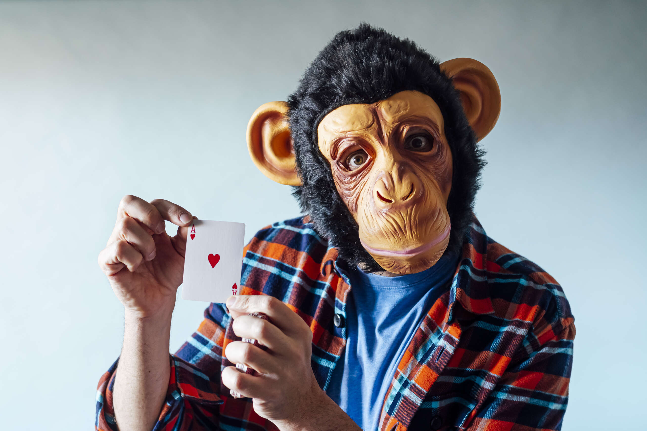 Man wearing monkey mask and holding poker playing cards on blue background.